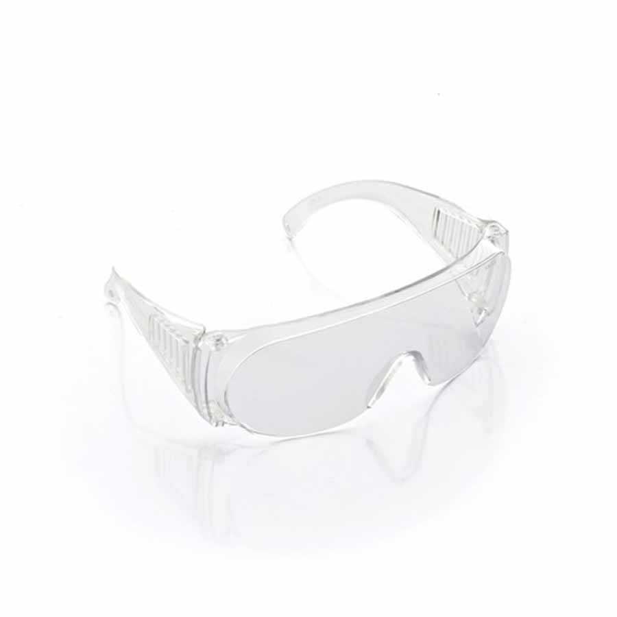 Óculos de segurança constituídos de armação e visor confeccionados em uma única peça de policarbonato incolor com meia borda superior e nas laterais, hastes tipo espátula confeccionadas do mesmo material do visor com seis fendas para ventilação sendo fixadas à armação através de pinos plásticos.