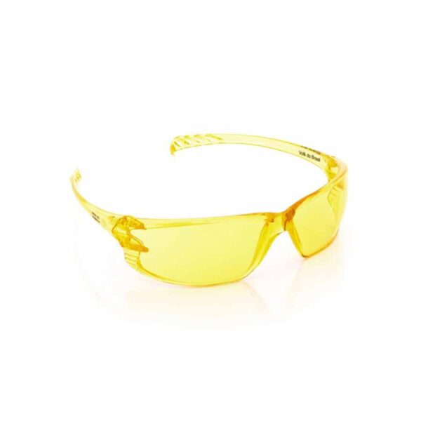 Óculos de segurança constituído de armação e visor confeccionados em uma única peça de policarbonato, disponível nas cores incolor, amarela, cinza, azul e incolor com revestimento externo espelhado na cor prata (espelhado IN and OUT), meia proteção lateral e apoio nasal injetado do mesmo material. As hastes, do tipo espátula, são confeccionadas em uma única peça do mesmo material do visor fixadas à extremidade do visor por meio de encaixe de dois pinos plásticos.