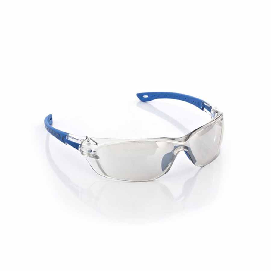 Óculos de segurança constituídos de armação e visor confeccionados em uma única peça de policarbonato disponível nas cores incolor, amarela, incolor com revestimento externo espelhado na cor prata (espelhado in/out), cinza e verde escuro com quatro pinos localizados na posição do nariz utilizados para encaixe do apoio nasal confeccionado em resina termoplástica maleável disponível nas cores preta e azul, hastes tipo espátula confeccionadas em duas peças sendo uma do mesmo material do visor disponível nas cores incolor, amarela e preta e a outra em borracha azul ou preta maleáveis, fixadas à extremidade do visor por meio de dois pinos plásticos.